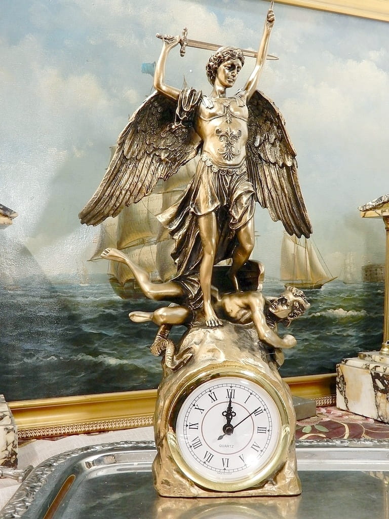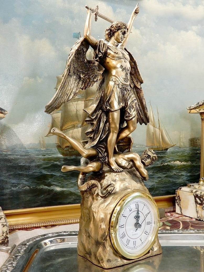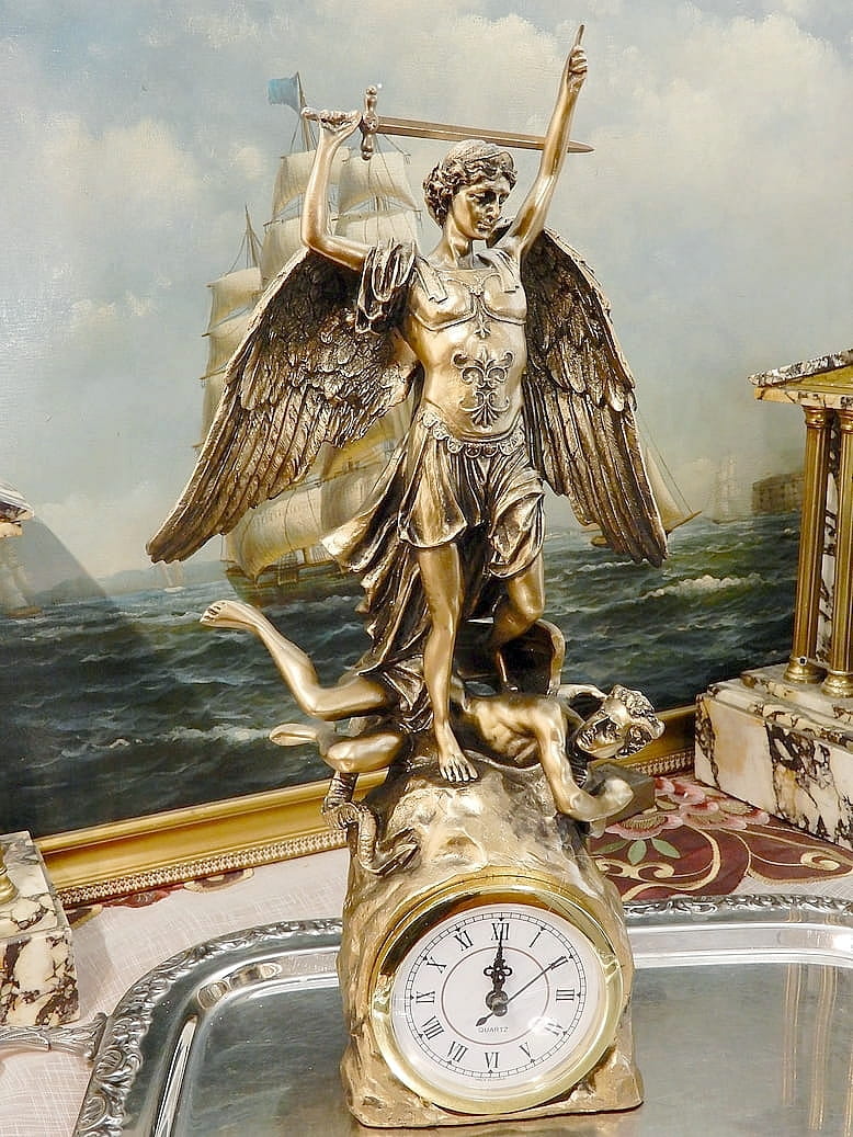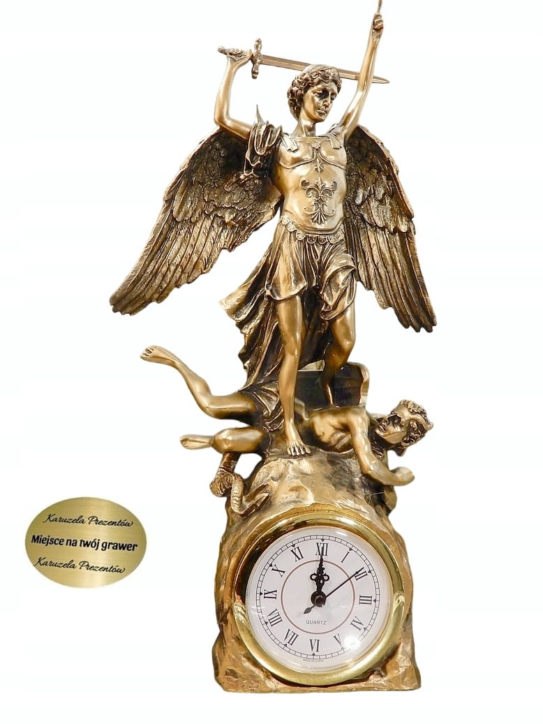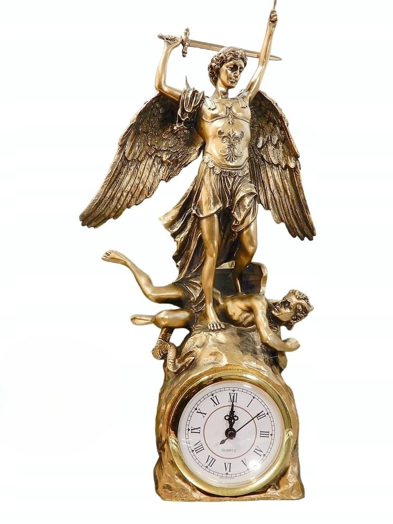 Zapraszamy do zakupu zegara kominkowego z figurką Archanioła Michała z uniesionym mieczem. Przyduszającym stopą szatana do ziemi.