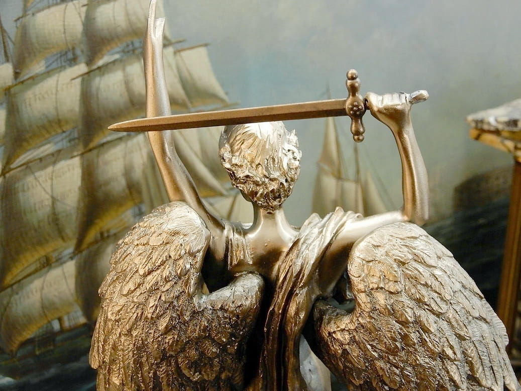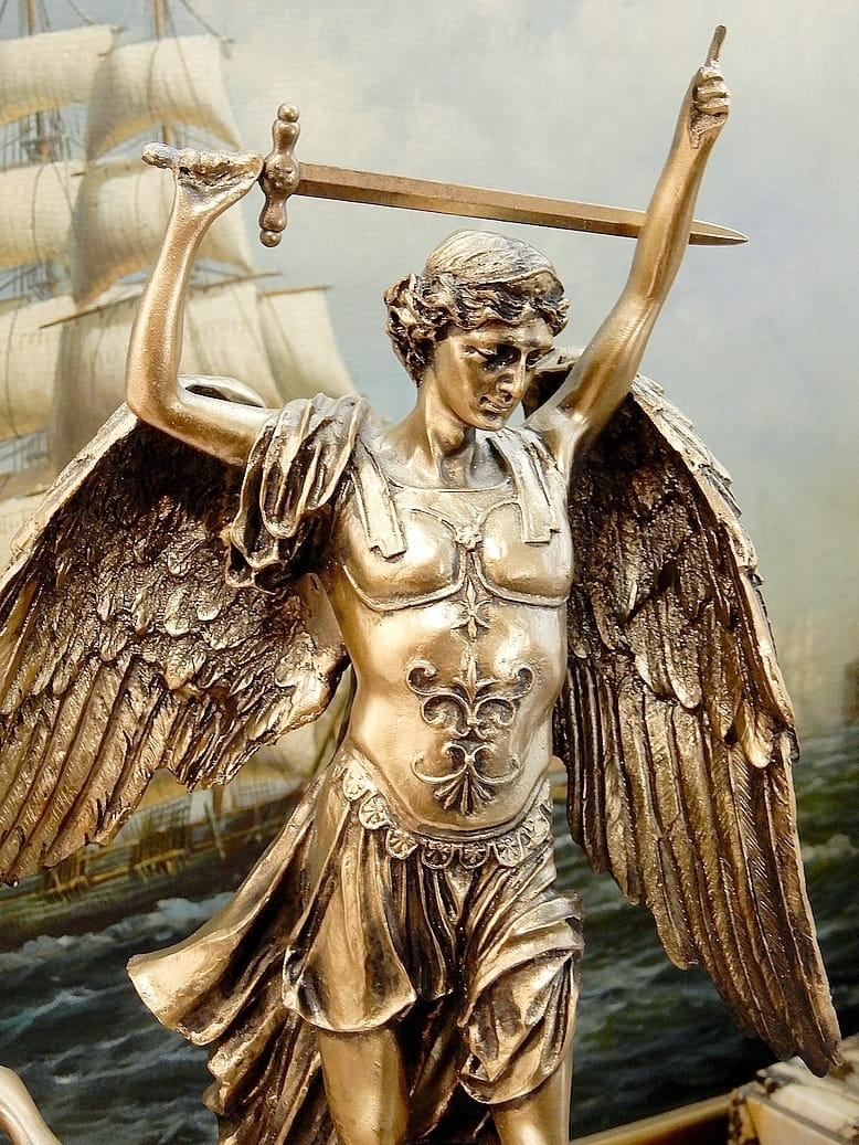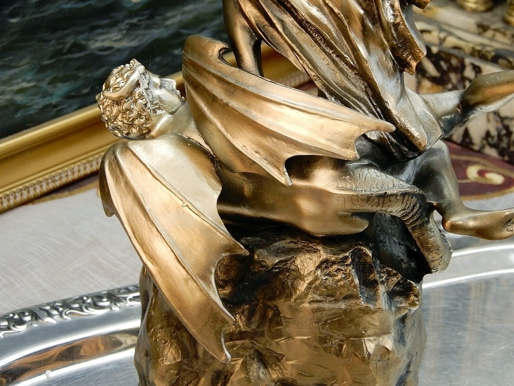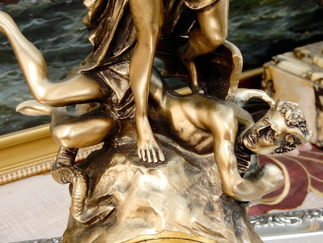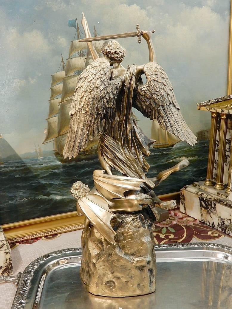 Zapraszamy do zakupu zegara kominkowego z figurką Archanioła Michała z uniesionym mieczem. Przyduszającym stopą szatana do ziemi.