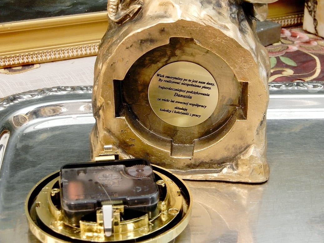 Wykonujemy indywidualny grawer laserowy na płytce z laminatu grawerskiego w złotym kolorze . Płytkę możemy przytwierdzić na spodzie zegara po uprzednim przyklejeniu 4 podkładek dystansowych z filcu lub bardziej dyskretnie, wewnątrz zegara. Jak na zdjęciu.