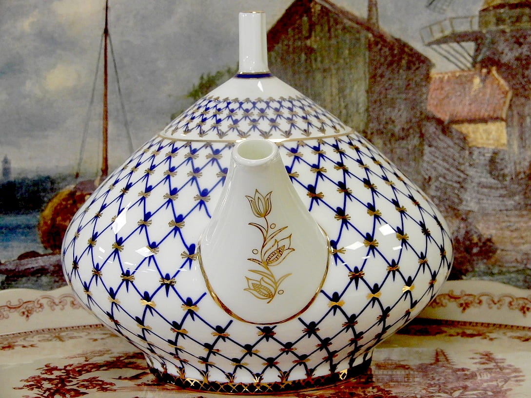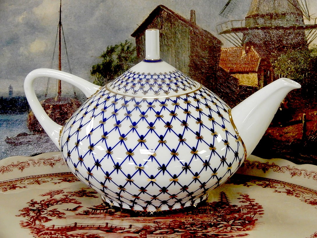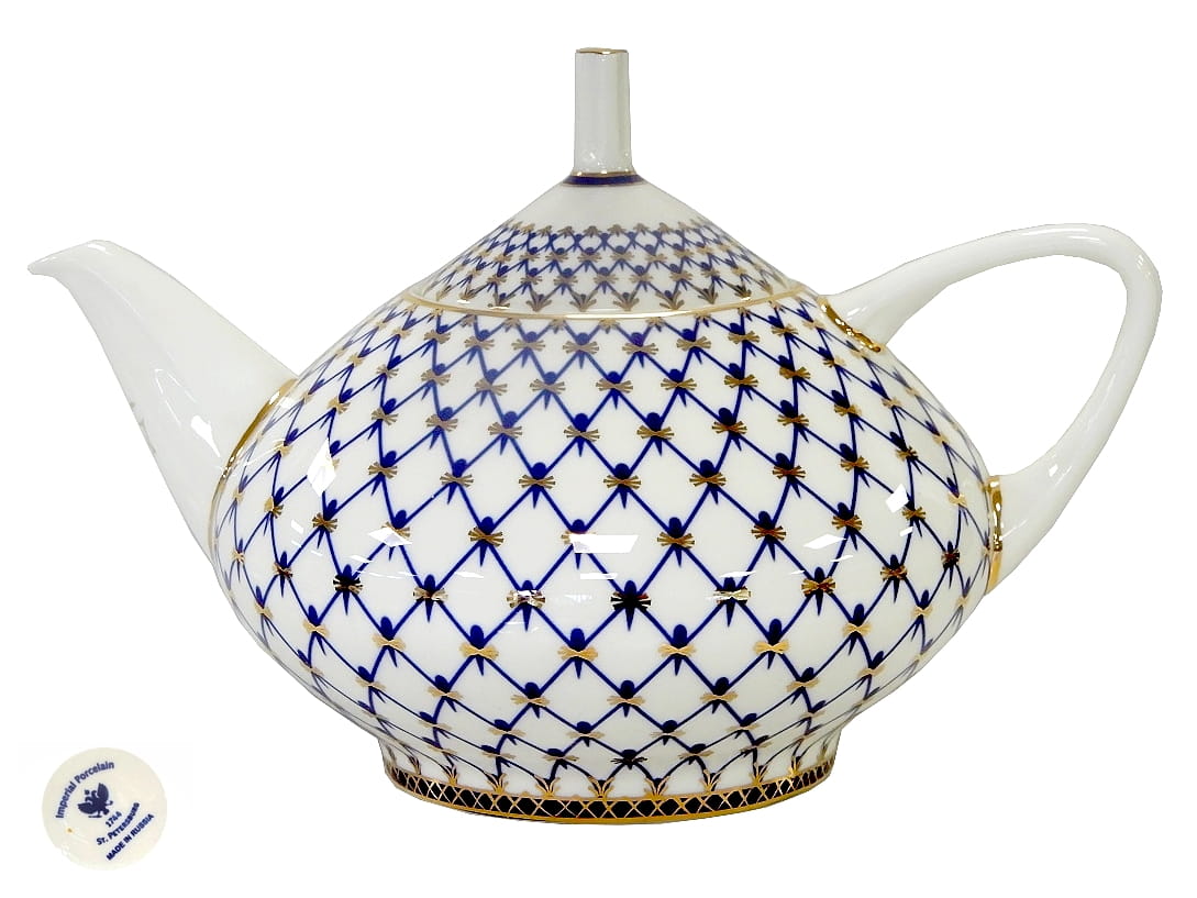 dzbanek porcelanowy do herbaty ozdobiony siatką kobaltową, z firmy Łomonosow Imperial Porcelain