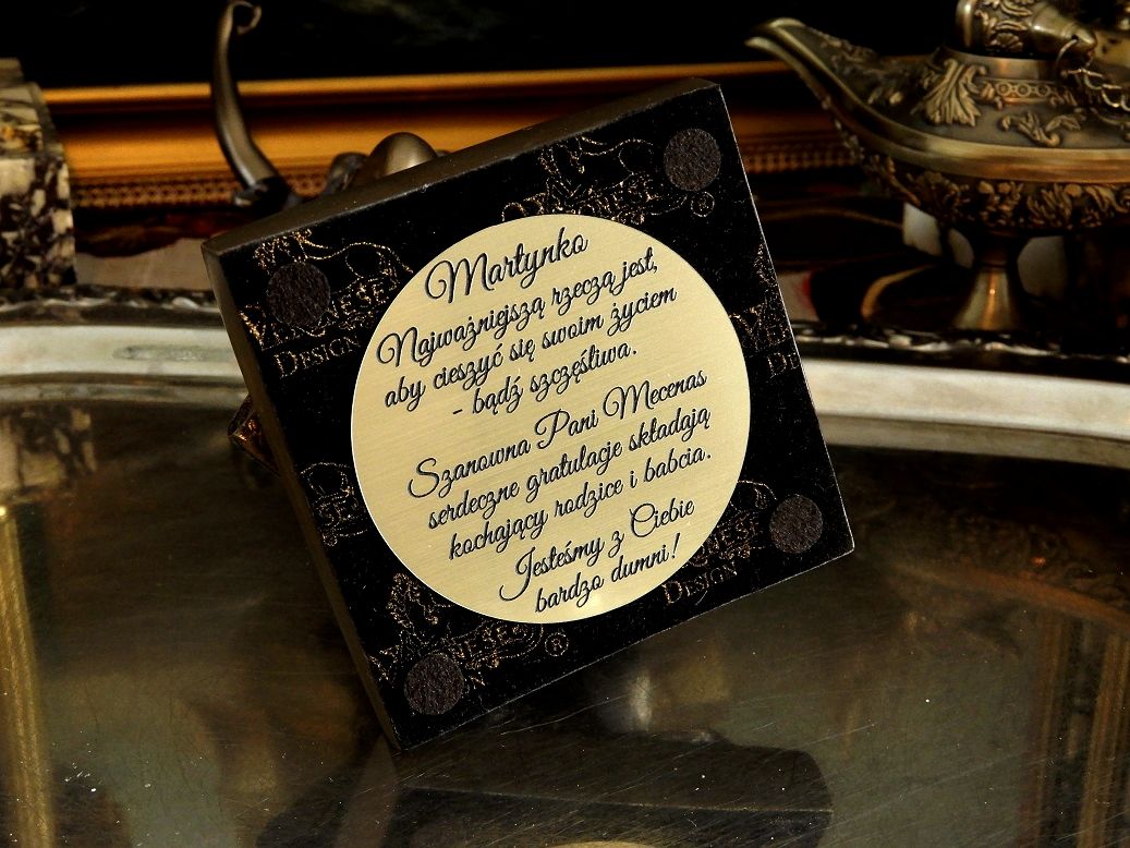 Marmurowa płytka tworzy cokół dla figurki. Możemy na pionowej powierzchni cokołu umieścić złotą płytkę z laminatu grawerskiego z Twoją dedykacją. Jak na załączonym przykładzie .To marmur kopalny i każda płytka jest trochę inna