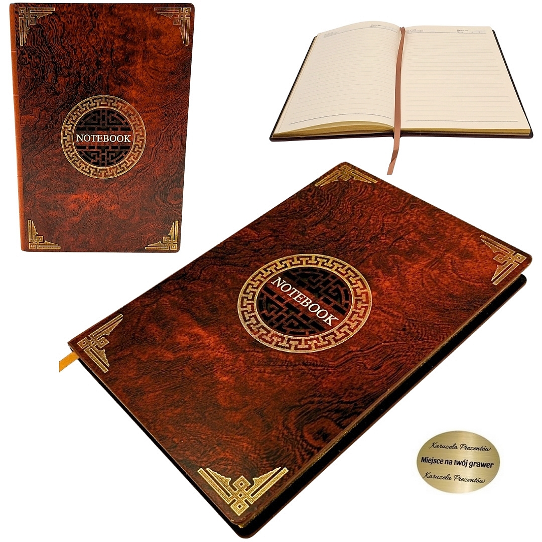Elegancki notes A5 w drewnianej okładce to połączenie klasycznego stylu, wysokiej jakości wykonania i funkcjonalności. Twarda oprawa w odcieniu brązu ma ozdobne złote detale, a brzegi stron wykończono złotem, co podkreśla jego prestiżowy charakter.