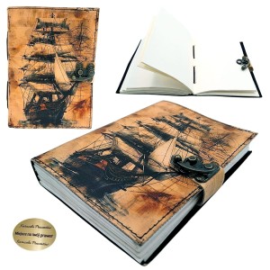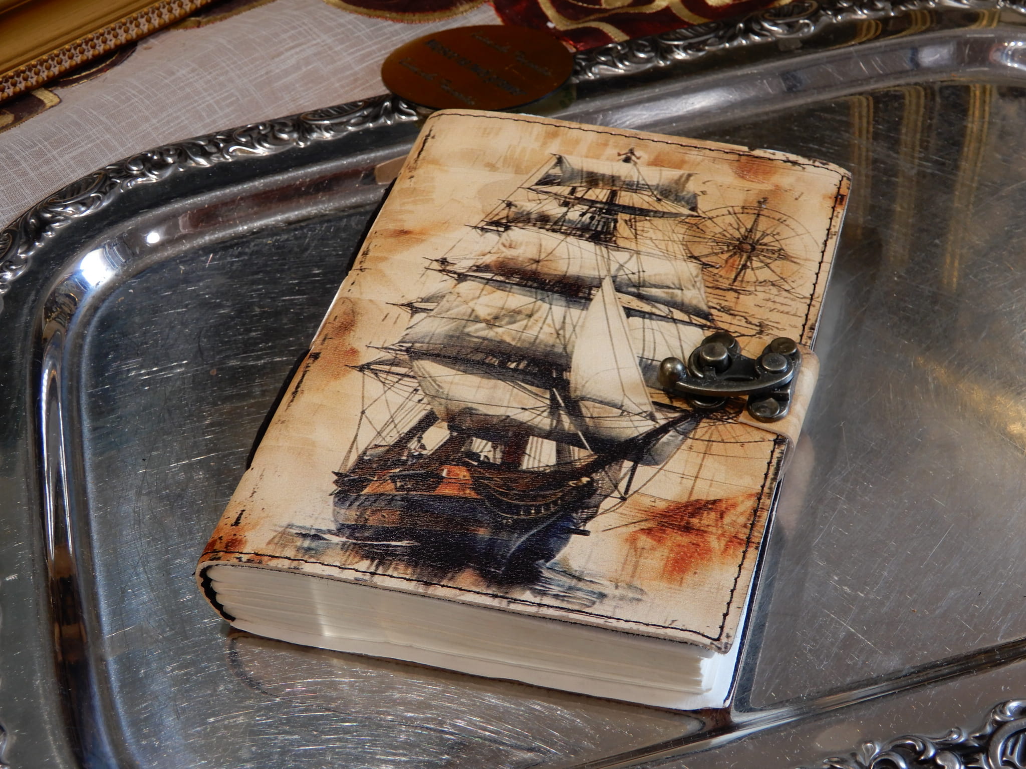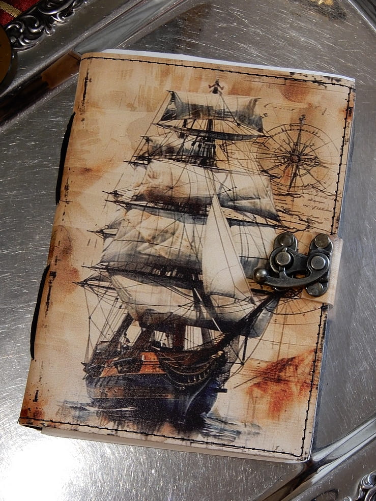 Wykonany z trwałej, naturalnej koziej skóry, ozdobiony nadrukiem flotylli żaglowców i kompasu – wygląda jakby sam Kapitan Nemo trzymał go przy sterze. To nie jest zeszyt z papiernika. To pamiętnik, szkicownik, notatnik kapitański, dziennik podróży – zależnie od Twojego kursu.