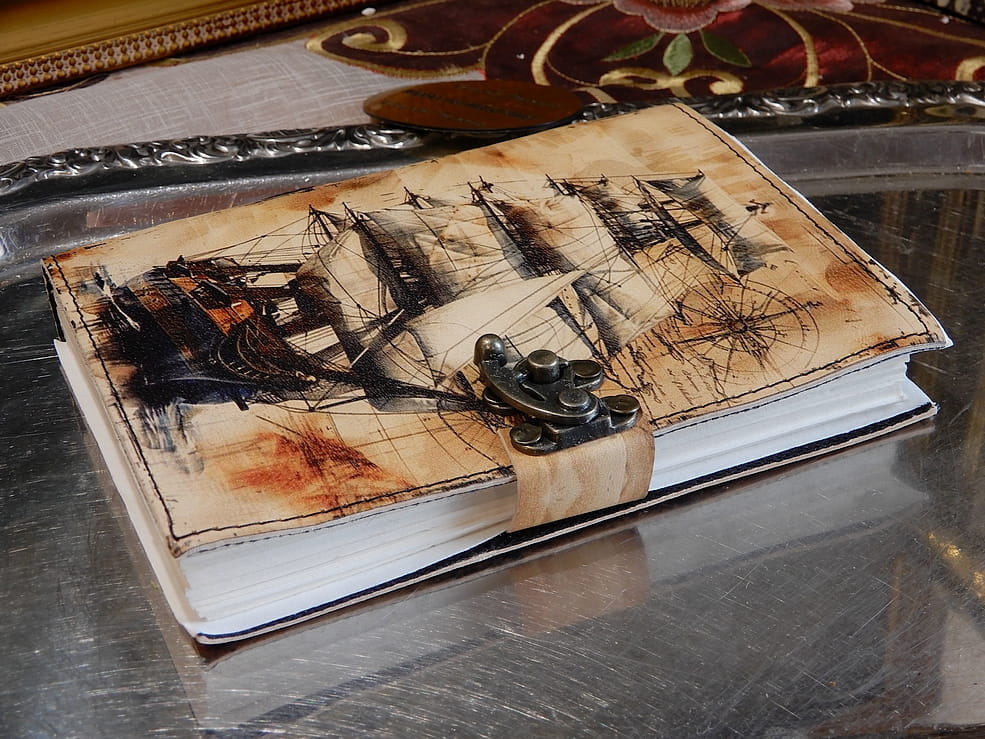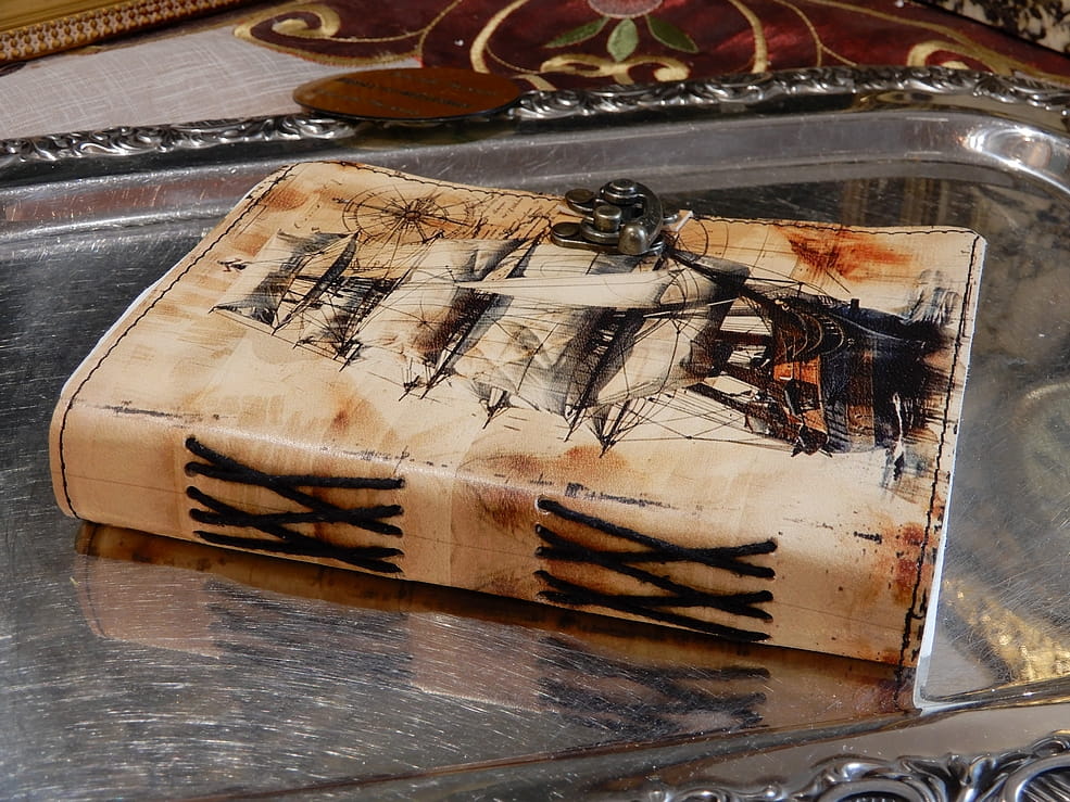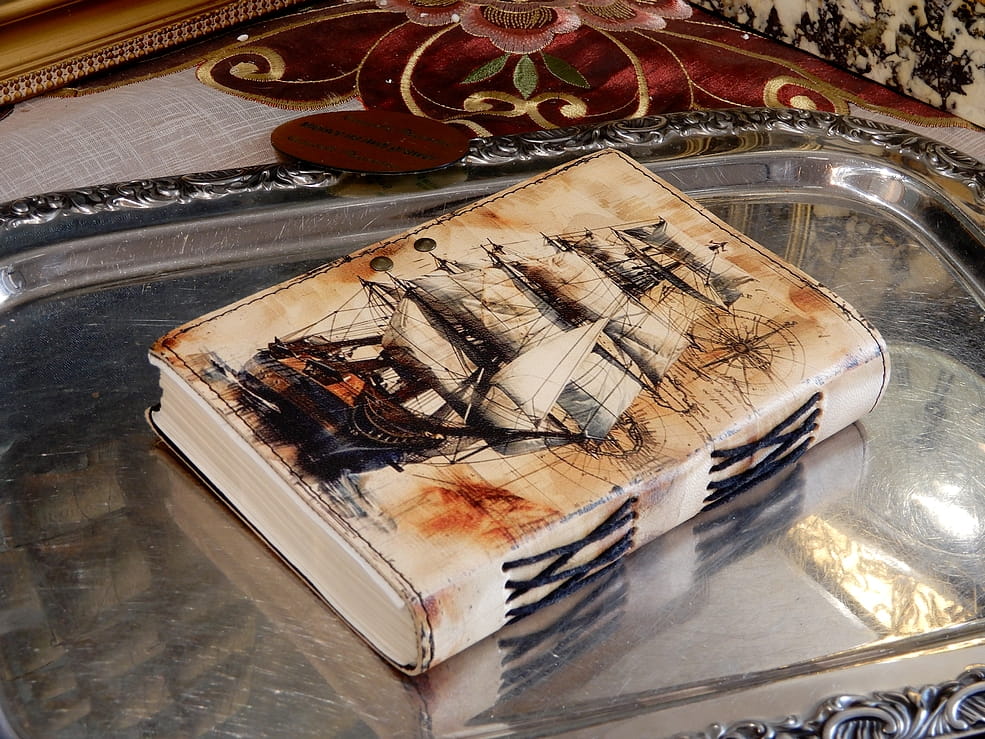 Skórzany notatnik marynistyczny z żaglowcem i kompasem dla żeglarza