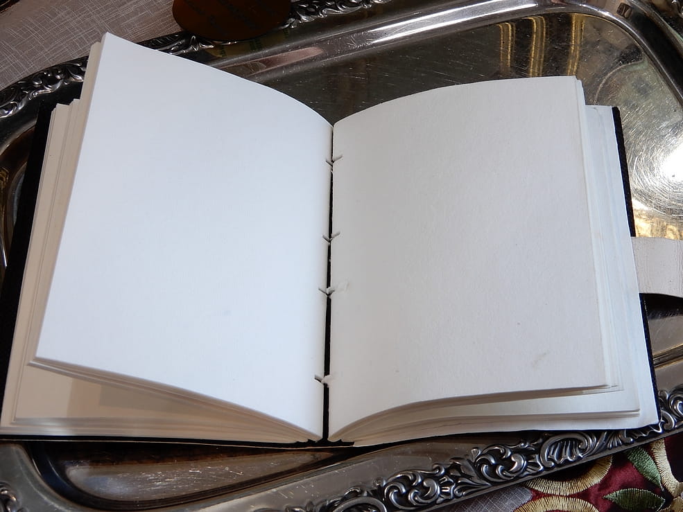 Środek skrywa 200 stron białego papieru o gramaturze 125 gsm, szytych ręcznie. Papier jest lekki, ale wyraźnie sztywniejszy niż zwykły biurowy, więc nie przebija i nie zawija się przy pisaniu. Idealny do pióra, długopisu, a nawet rysunku. Przesuwne metalowe zapięcie trzyma całość w ryzach, nawet w czasie sztormu (czyli np. w plecaku w tramwaju).