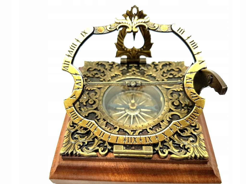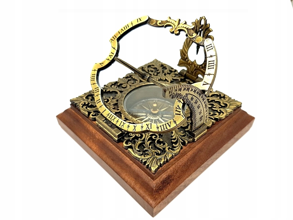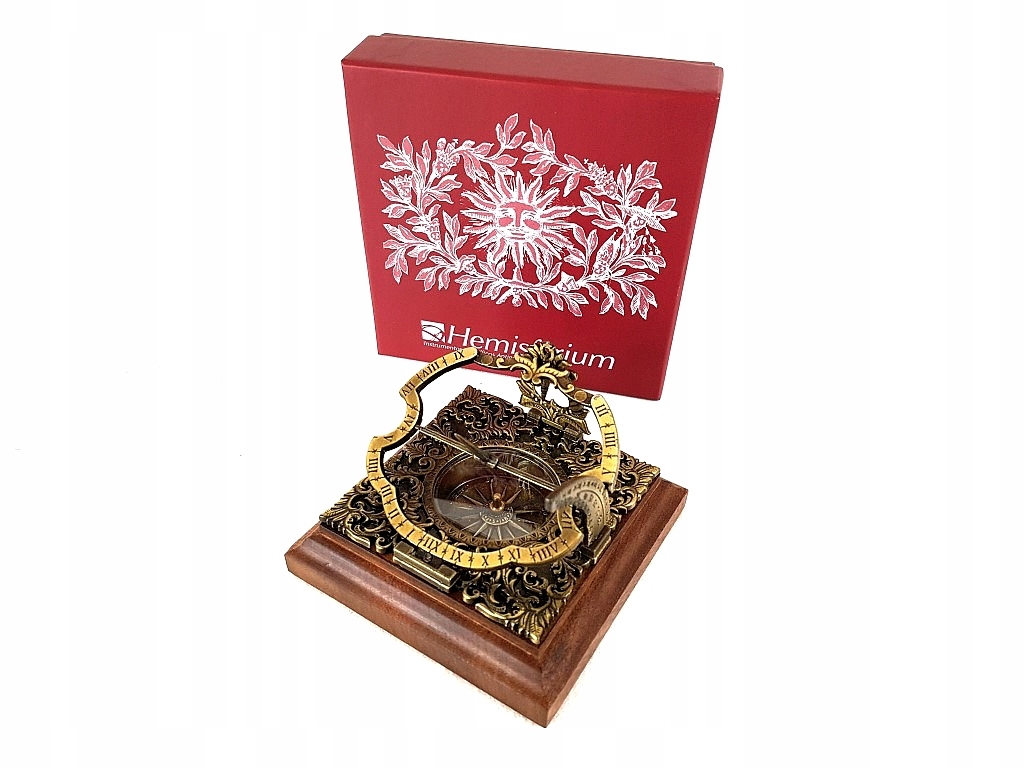 Mosiężny zegar słoneczny Habsburg H30 - reprodukcja. Przepiękny, bogato zdobiony zegar słoneczny Habsburg. Na drewnianej podstawie. Wys. 10cm, szer. 10cm,. Uniwersalny zegar słoneczny oryginalnie zbudowany w Niemczech, styl augsburski, model z XVIII w.